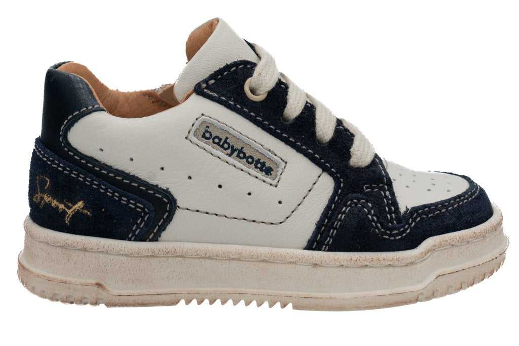 Chaussure petit garçon premiers pas à lacets et fermeture éclair. Tige en cuir blanc cassé . Doublure en cuir et semelle en caoutchouc.