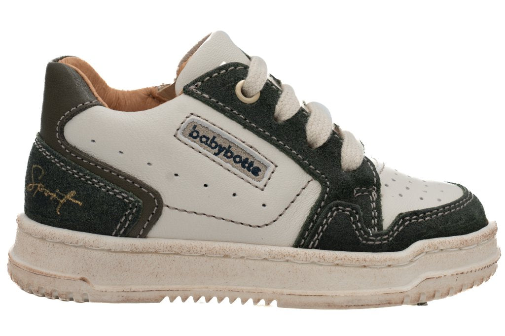 Chaussure petit garçon premiers pas à lacets et fermeture éclair. Tige en cuir blanc cassé . Doublure en cuir et semelle en caoutchouc.