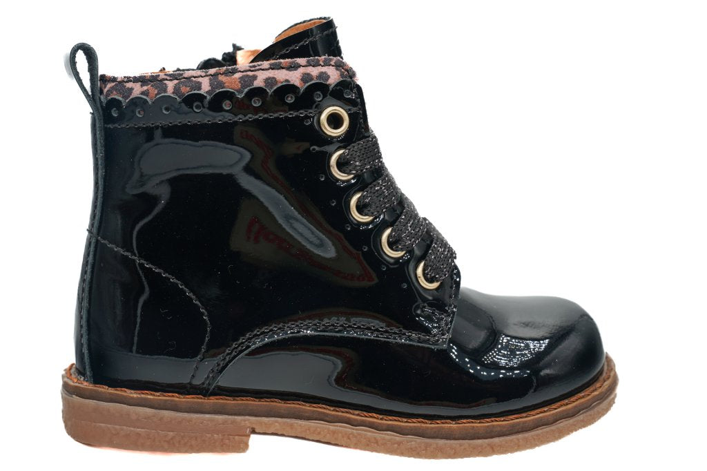 bottine petite fille à lacets et fermeture éclaire. Tige en cuir vernis noir Détail paillette sur l'arrière . Doublure en cuir et semelle en caoutchouc.