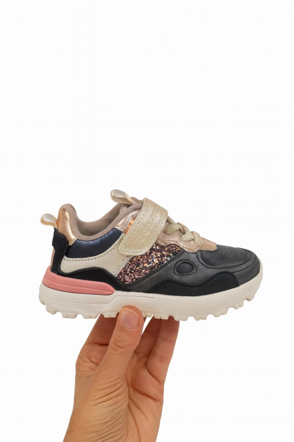 Cette basket pour enfants est présentée dans une version en textile pailleté et empiècements multicolores. Cette chaussure souple et légère se chausse et se déchausse facilement grâce à ses lacets élastiques et son scratch.