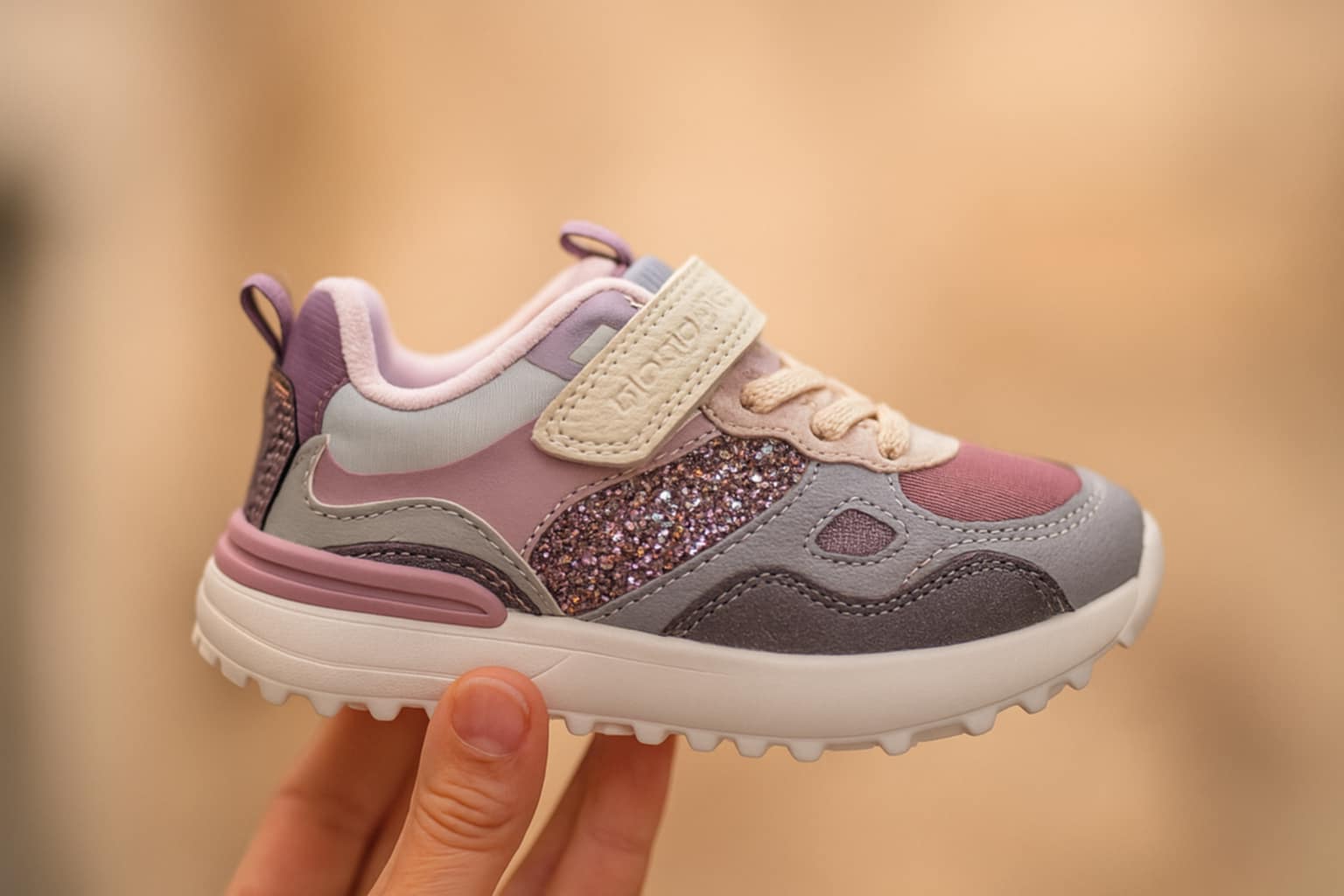 Cette basket pour enfants est présentée dans une version en textile pailleté et empiècements multicolores. Cette chaussure souple et légère se chausse et se déchausse facilement grâce à ses lacets élastiques et son scratch.
