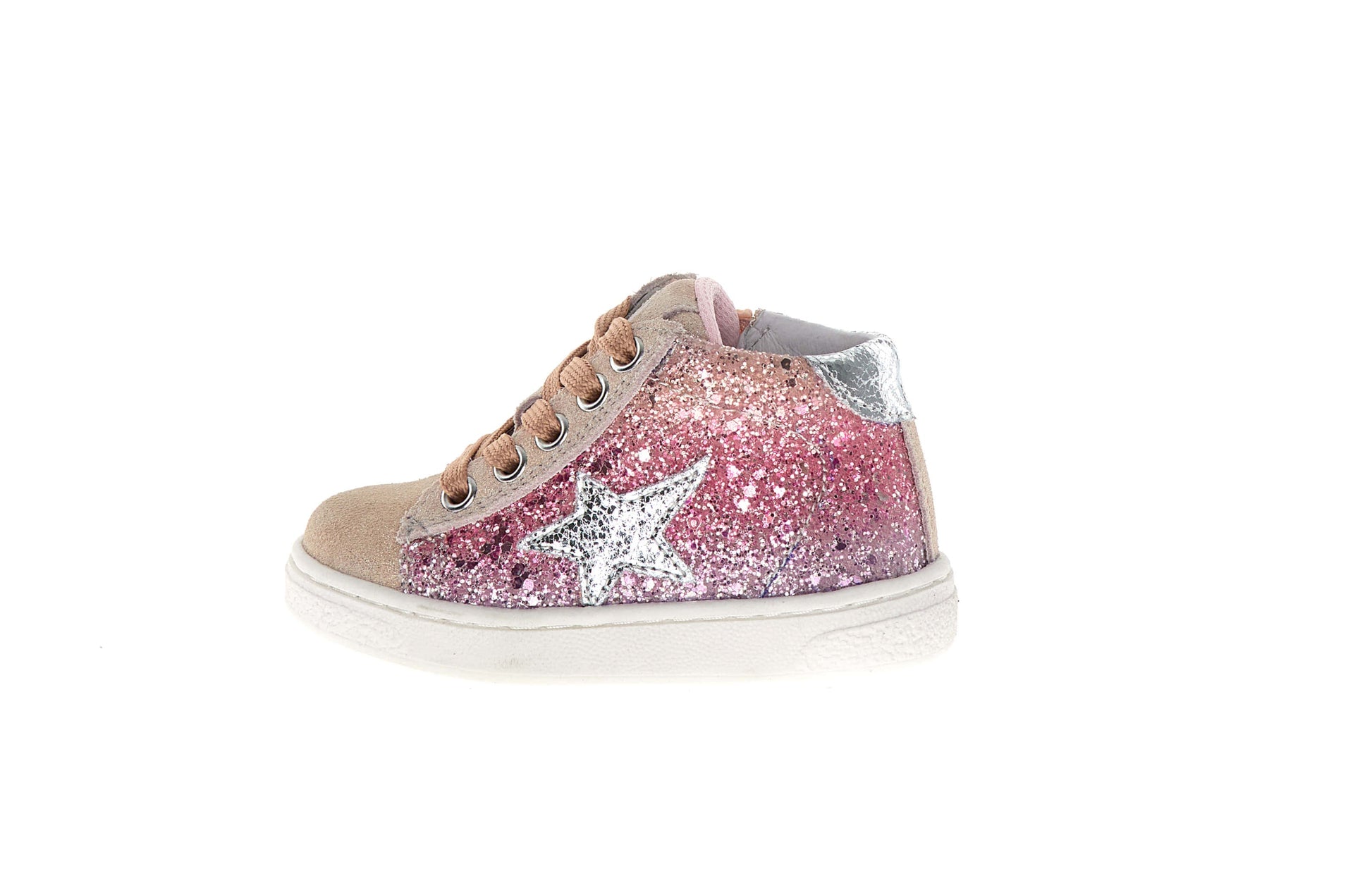 Ankle trainer avec côtés en tissu pailleté et bout en cuir ton sur ton. Le modèle est complété par un patch étoile sur le côté et une fermeture à lacets en lurex avec un zip interne. Doublure et semelle intérieure en cuir, semelle en caoutchouc.