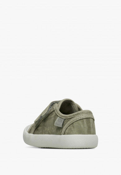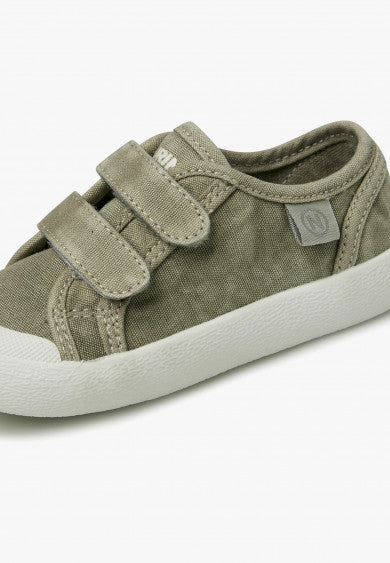 Basket en toile délavée avec fermeture double scratch, doublure en tissu et semelle en caoutchouc avec bout renforcé.